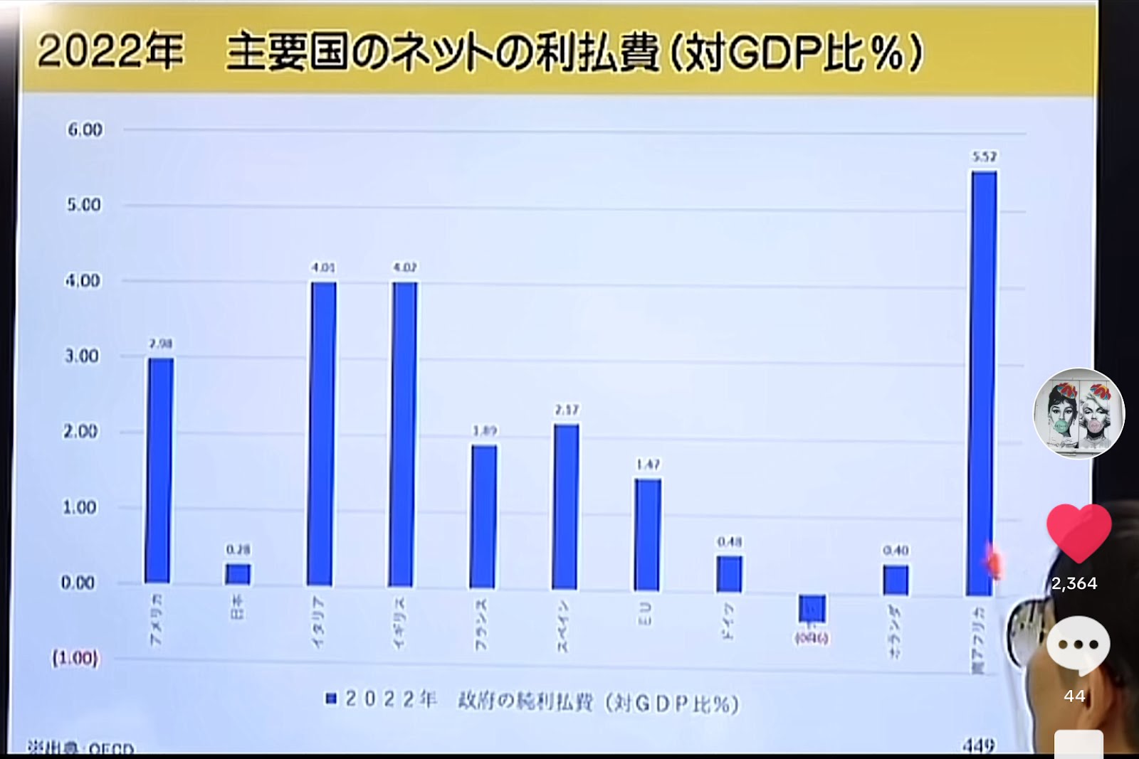 三橋貴明 2022年主要国のネットの利払い費(対GDP比%)