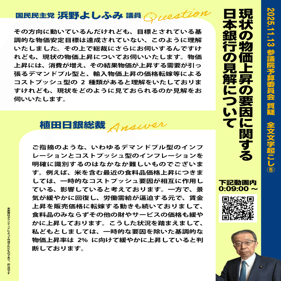 浜野議員:その方向に動いているんだけれども、目標とされている基調的な物価安定目標は達成されていない、このように理解いたしました。その上で総裁にさらにお伺いするんですけれども、現状の物価上昇についてお伺いいたします。物価上昇には、消費が増え、その結果物価が上昇する需要が引っ張るデマンドプル型と、輸入物価上昇の価格転嫁等によるコストプッシュ型の2種類があると理解をいたしておりますけれども、現状をどのように見ておられるのか見解をお伺いいたします。