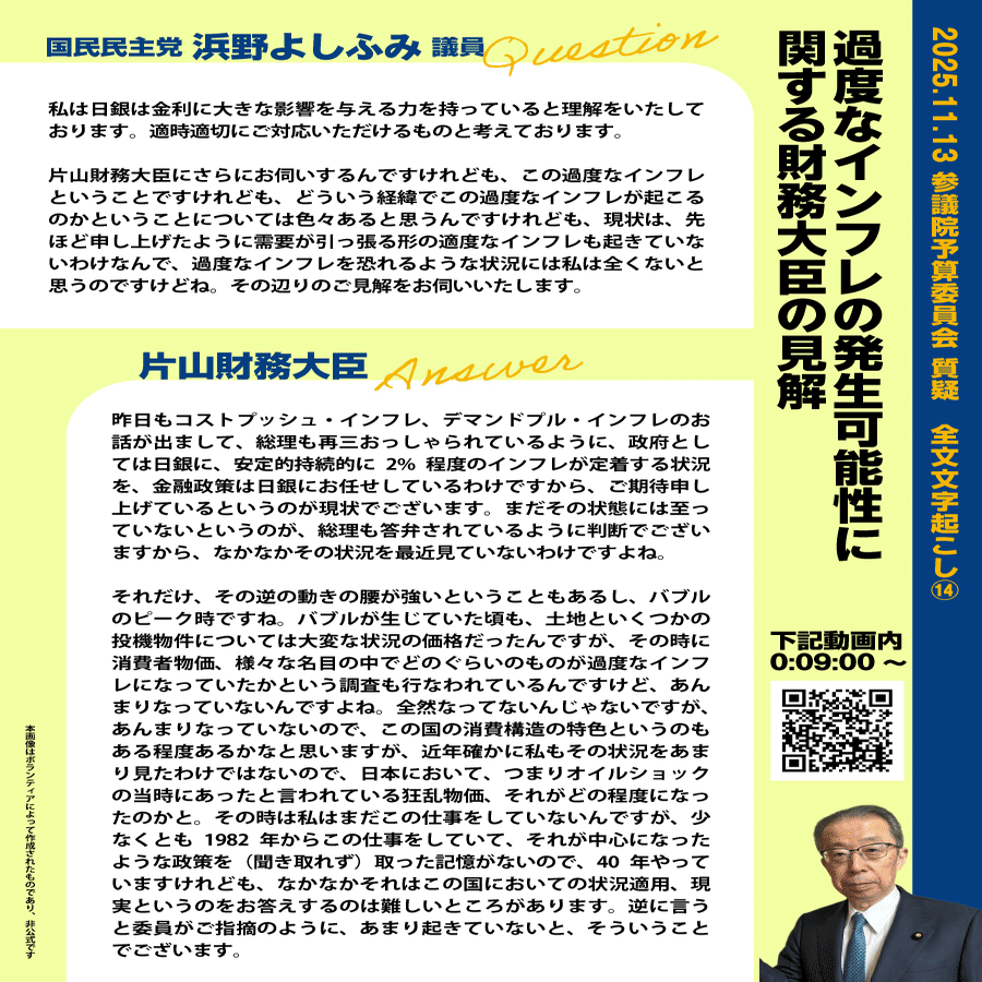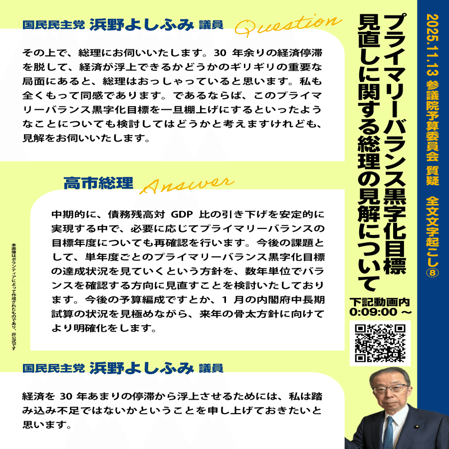 2025.11.13 国民民主党 浜野よしふみ議員 参議院予算委員会 (全文文字起こし)