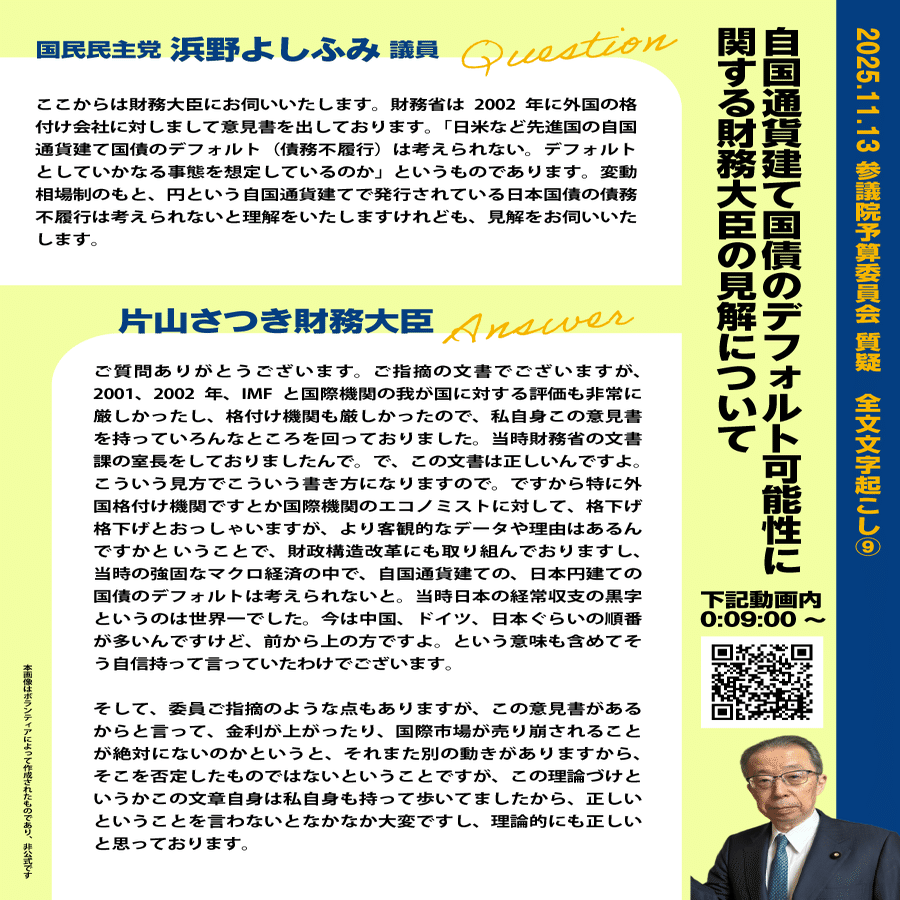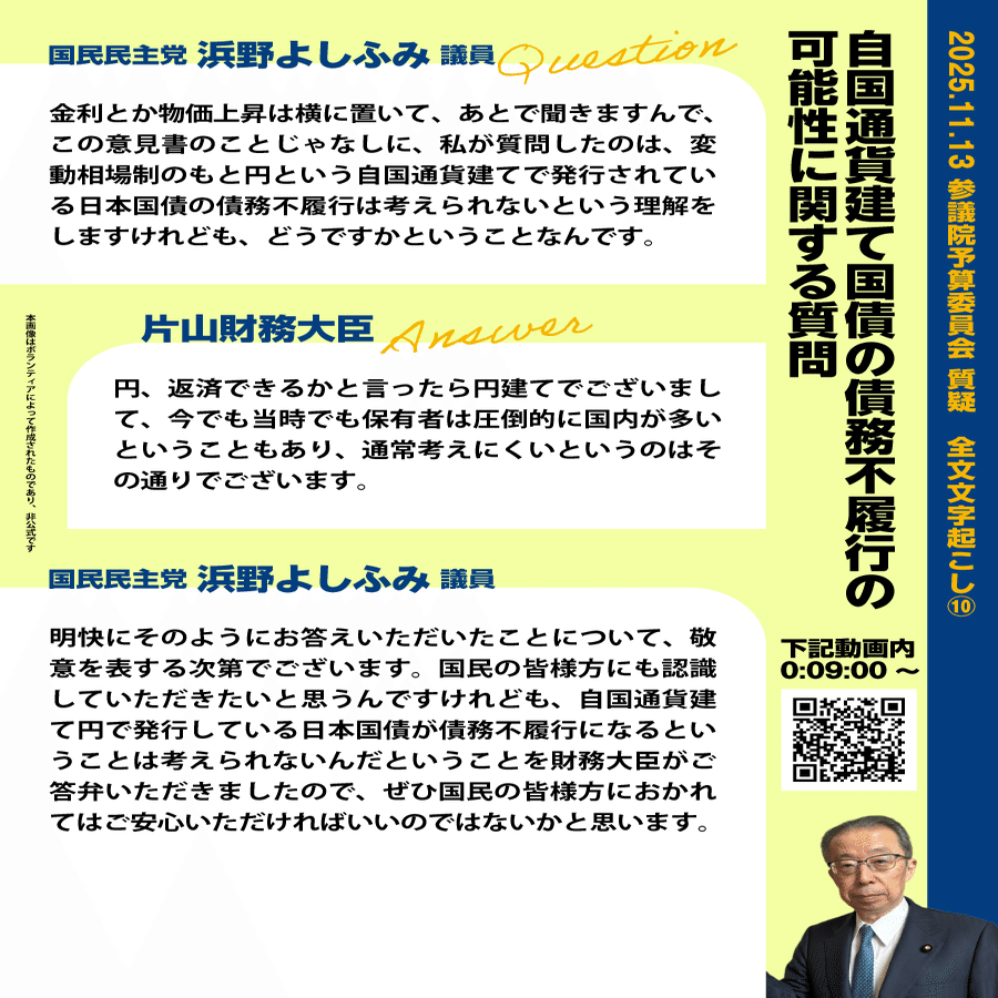浜野議員:明快にそのようにお答えいただいたことについて、敬意を表する次第でございます。国民の皆様方にも認識していただきたいと思うんですけれども、自国通貨建て円で発行している日本国債が債務不履行になるということは考えられないんだということを財務大臣がご答弁いただきましたので、ぜひ国民の皆様方におかれてはご安心いただければいいのではないかと思います。