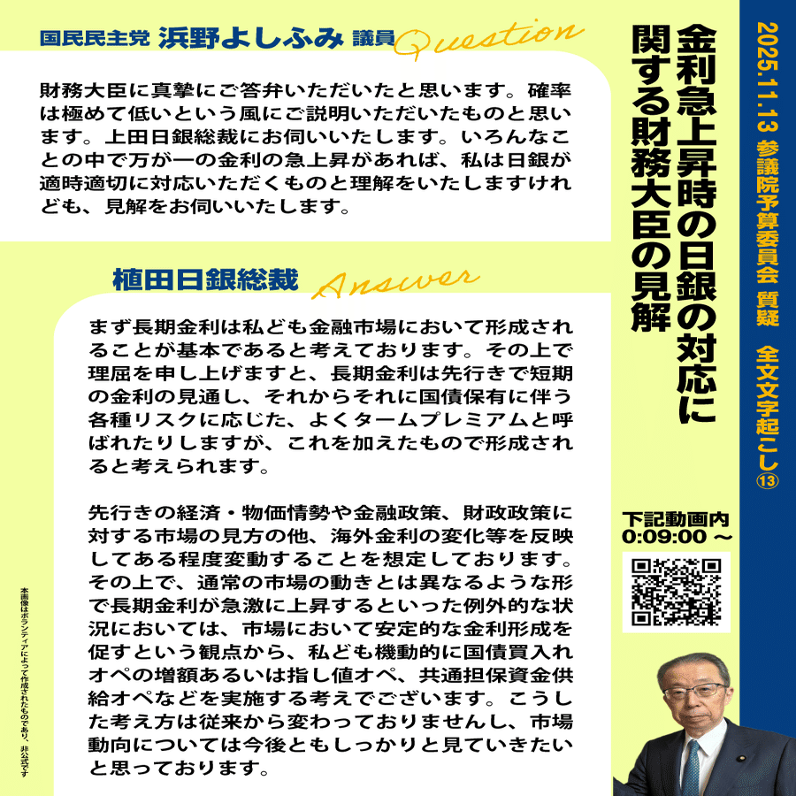 浜野議員:財務大臣に真摯にご答弁いただいたと思います。確率は極めて低いという風にご説明いただいたものと思います。上田日銀総裁にお伺いいたします。いろんなことの中で万が一の金利の急上昇があれば、私は日銀が適時適切に対応いただくものと理解をいたしますけれども、見解をお伺いいたします。