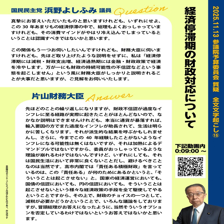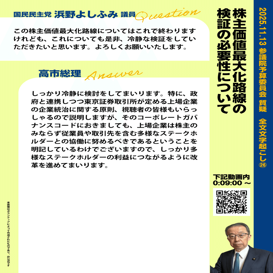 浜野議員:これで質問を終わらせていただきますが、大経済学者のケインズが、危険なのは既得権ではなく思想だということをおっしゃったということをある論説で私は知りました。全くもってその通りだと思います。思想がやはり社会を決めるとということだと思います。くどいようですが、財政健全化、株主価値最大化というこの思想が正しいのかどうか、高市総理なら冷静に検証していただけると思いますので、それをお願い申し上げて質問を終わります。ありがとうございました。
