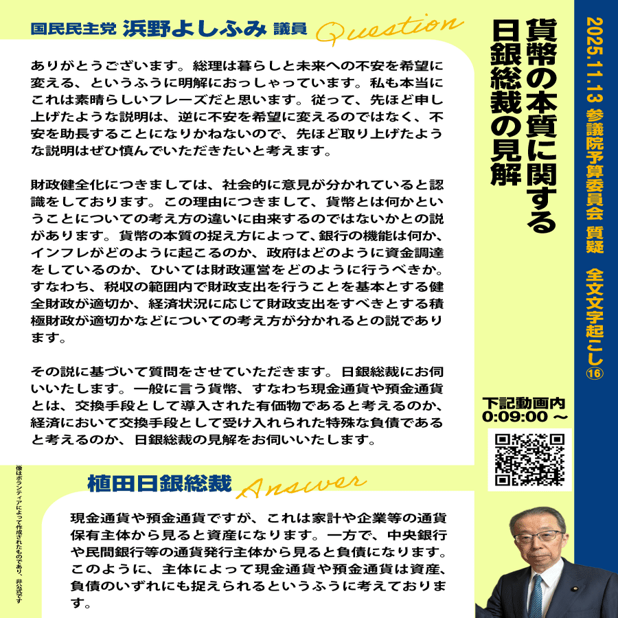 浜野議員:公式見解としてそういう説明になると思うんですけれども、日銀の会計上は、総裁が説明されたようにバランスシート上負債に位置づけられておりまして、それが世の中に流通しているということなので、負債であるという見方が正しい見方ではないかなと私は思います。
