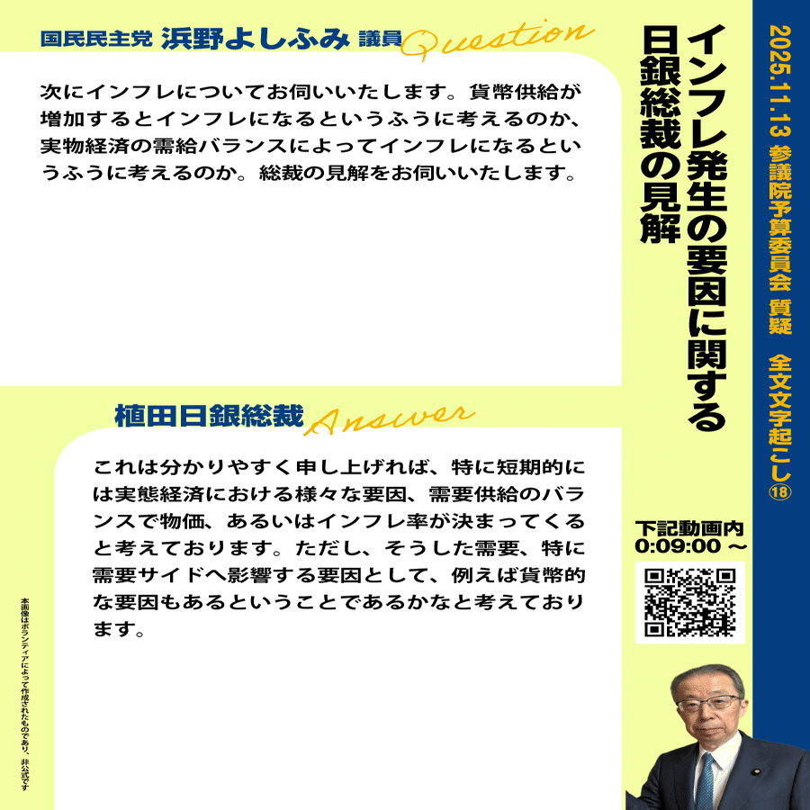浜野議員:次にインフレについてお伺いいたします。貨幣供給が増加するとインフレになるというふうに考えるのか、実物経済の需給バランスによってインフレになるというふうに考えるのか。総裁の見解をお伺いいたします。