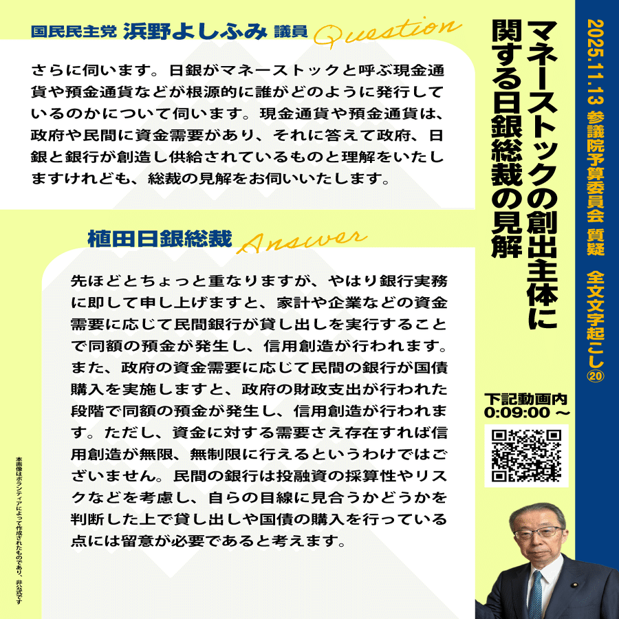 浜野議員:さらに伺います。日銀がマネーストックと呼ぶ現金通貨や預金通貨などが根源的に誰がどのように発行しているのかについて伺います。現金通貨や預金通貨は、政府や民間に資金需要があり、それに答えて政府、日銀と銀行が創造し供給されているものと理解をいたしますけれども、総裁の見解をお伺いいたします。