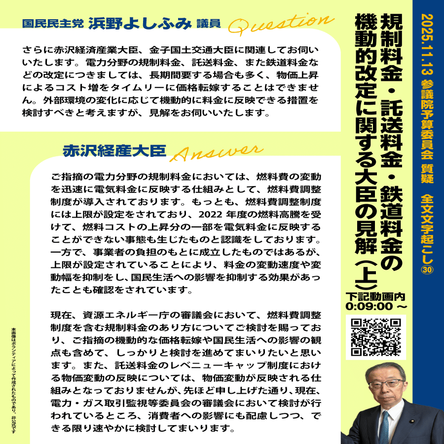 浜野議員:さらに赤沢経済産業大臣、金子国土交通大臣に関連してお伺いいたします。電力分野の規制料金、託送料金、また鉄道料金などの改定につきましては、長期間要する場合も多く、物価上昇によるコスト増をタイムリーに価格転嫁することはできません。外部環境の変化に応じて機動的に料金に反映できる措置を検討すべきと考えますが、見解をお伺いいたします。