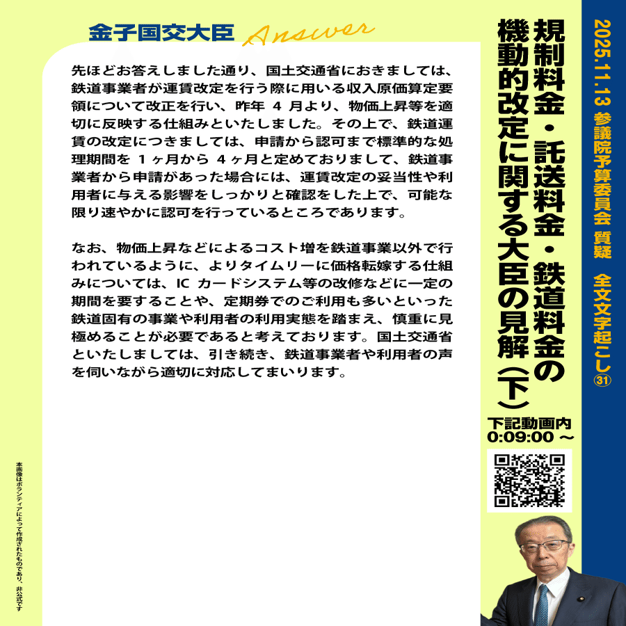 金子国交大臣:先ほどお答えしました通り、国土交通省におきましては、鉄道事業者が運賃改定を行う際に用いる収入原価算定要領について改正を行い、昨年4月より、物価上昇等を適切に反映する仕組みといたしました。その上で、鉄道運賃の改定につきましては、申請から認可まで標準的な処理期間を1ヶ月から4ヶ月と定めておりまして、鉄道事業者から申請があった場合には、運賃改定の妥当性や利用者に与える影響をしっかりと確認をした上で、可能な限り速やかに認可を行っているところであります。