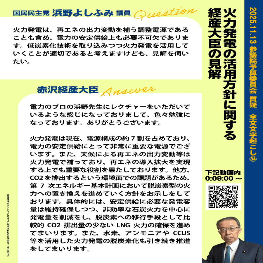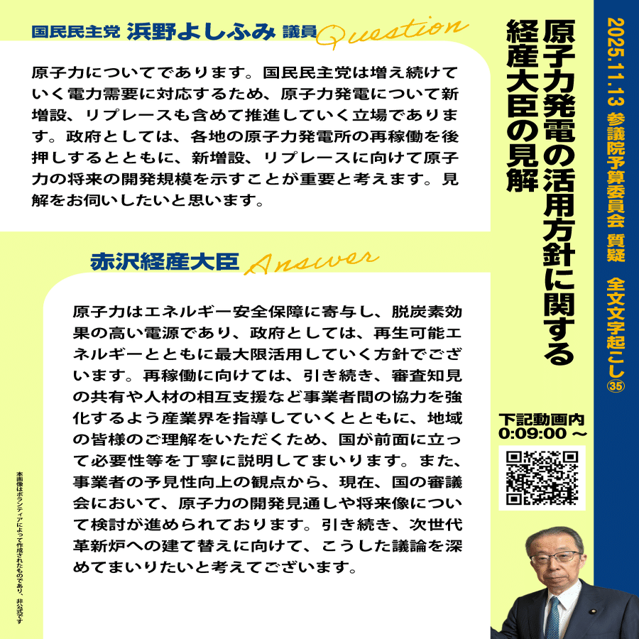 浜野議員:原子力についてであります。国民民主党は増え続けていく電力需要に対応するため、原子力発電について新増設、リプレースも含めて推進していく立場であります。政府としては、各地の原子力発電所の再稼働を後押しするとともに、新増設、リプレースに向けて原子力の将来の開発規模を示すことが重要と考えます。見解をお伺いしたいと思います。