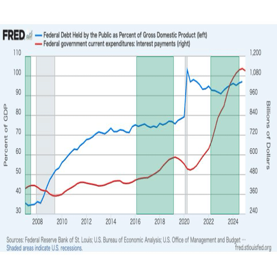 2007年頃35%台の利払い費ピークが0.4兆ドルだったのに対し、2024年100%超えの利払い費ピークが1.1兆ドルと、確かに3倍ほどに膨れ上がっている。