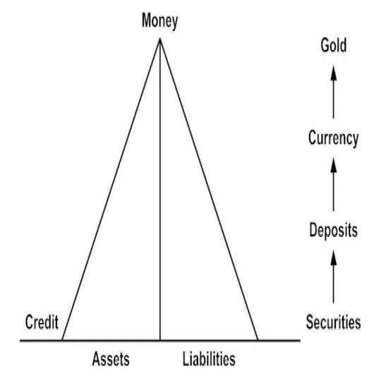 変動相場制だと、政府信用(通貨)とその他の信用(ローンや社債など民間信用)を除けば、こうしたピラミッド構造は存在しないけど、金本位制の場合は「金(ゴールド)からどれだけ遠いか」でピラミッドが構成されていたんだ。